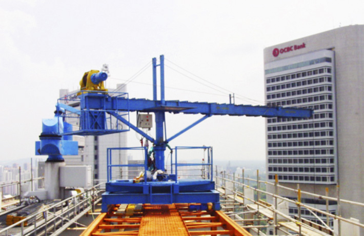 With a 16 metre outreach and a hoisting capacity of 500kg, "Little Blue" was specially designed to cater to the entire building's facade makeover.